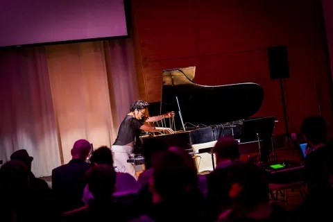 “The variety of realizations of the data was the most impressive thing,” said SFCM alumnus Erik Walker ’81, a composer on the ClimateMusic Project’s team who attended the concert. “Every piece took a different angle on how to implement climate data and have it control [or] modify music and sound. The drone piece, the ’tree’ piece (especially the control on harmony), the interactive website piece—all of them gave me something to think about. I particularly liked the ‘talking heads of climate deniers’ being affected by the climate data, basically blowing them up. That was art. Given the time frame for the completion of the pieces, the students did an amazing job.”